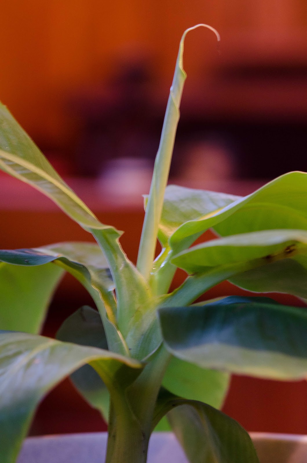 This is my SDC banana plant #1. It grew a tall leaf, but I think it's cold as its refusing to open the leaf fully. This is a after I misted it a little so you can see the droplets.